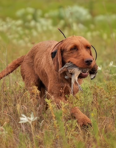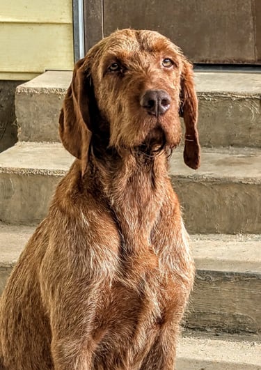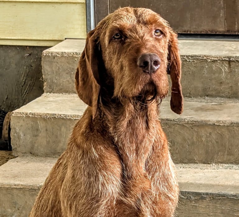 Originally owned, handled & loved by Belinda DeLaby - Buffalo Creek Kennels & Gun Dog Training. We where introduced to Janos in the spring of 2022 at Belinda's house in Oklahoma during a Training Seminar and immediately fell in love w/ him. He comes from extremely talented field trial lines we have always admired. Janos has an excellent nose, correct coat, a beautiful point/style in the field, great cooperation / trainability, lovely conformation and a great personality with an off switch in the home that we believe a good Wirehaired Vizsla should have.