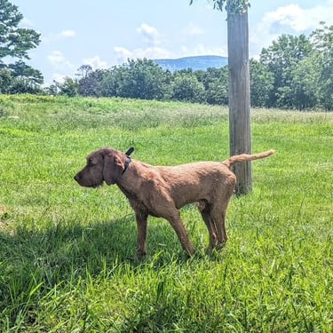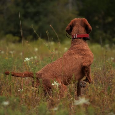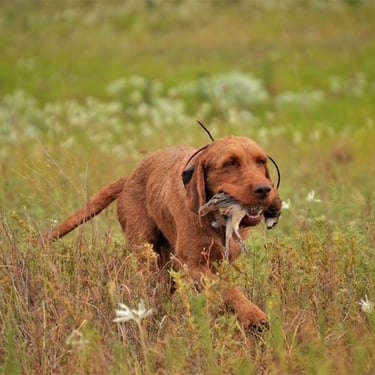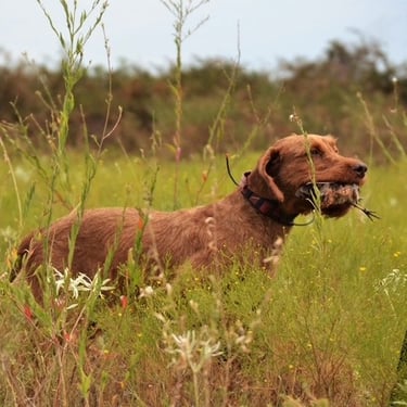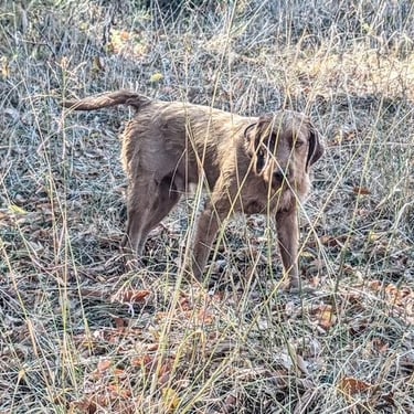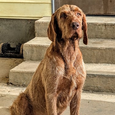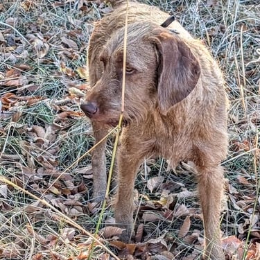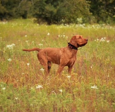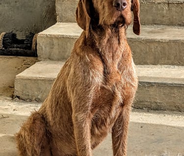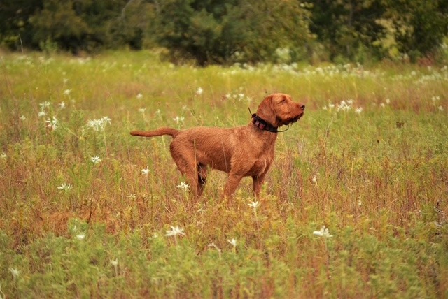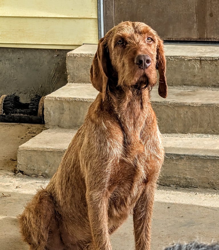 Janos has an excellent nose, correct coat, a beautiful point/style in the field, great cooperation / trainability, lovely conformation and a great personality with an off switch in the home that we believe a good Wirehaired Vizsla should have.
